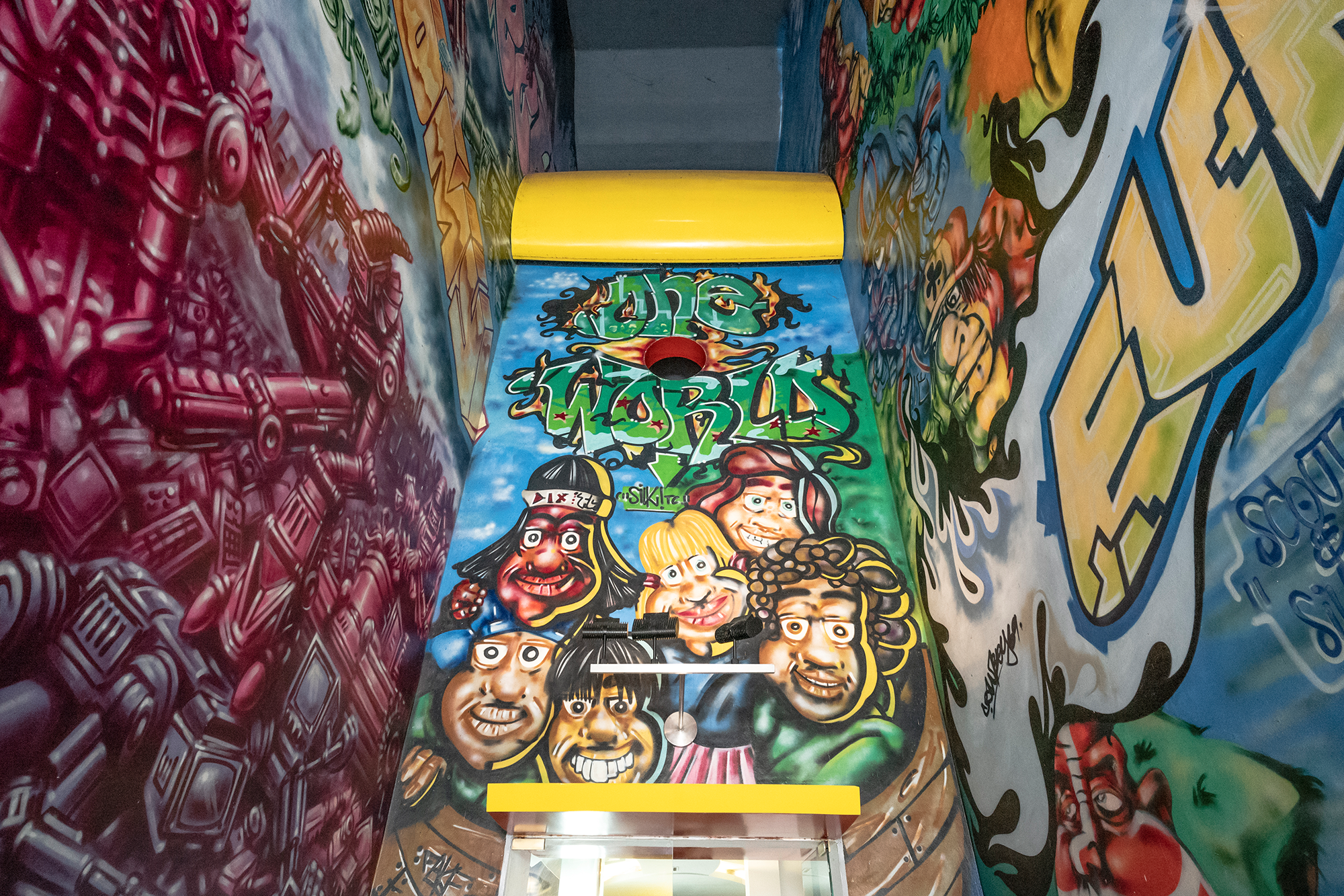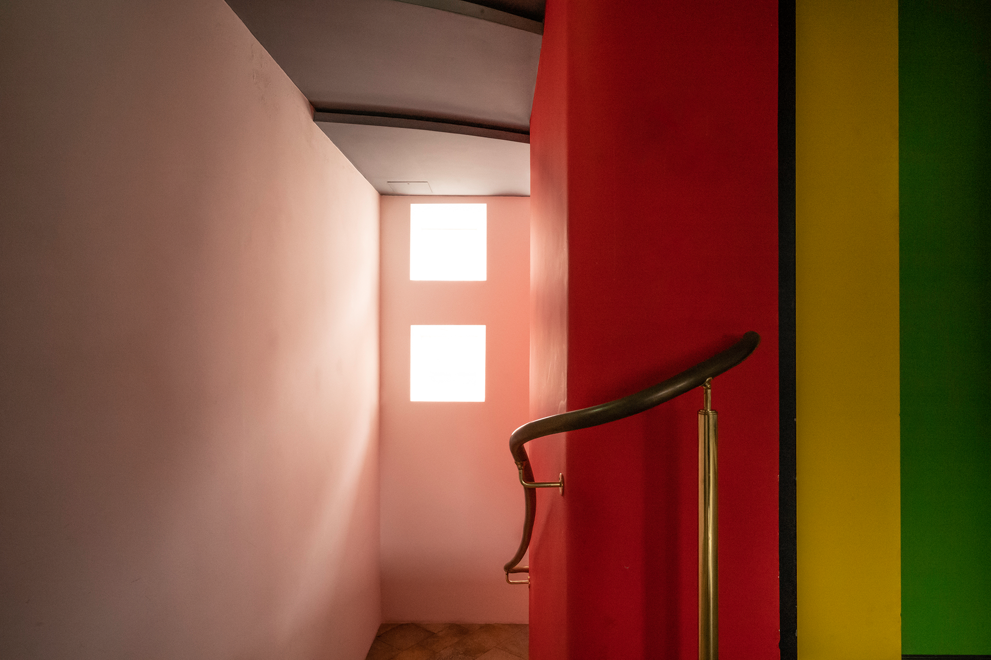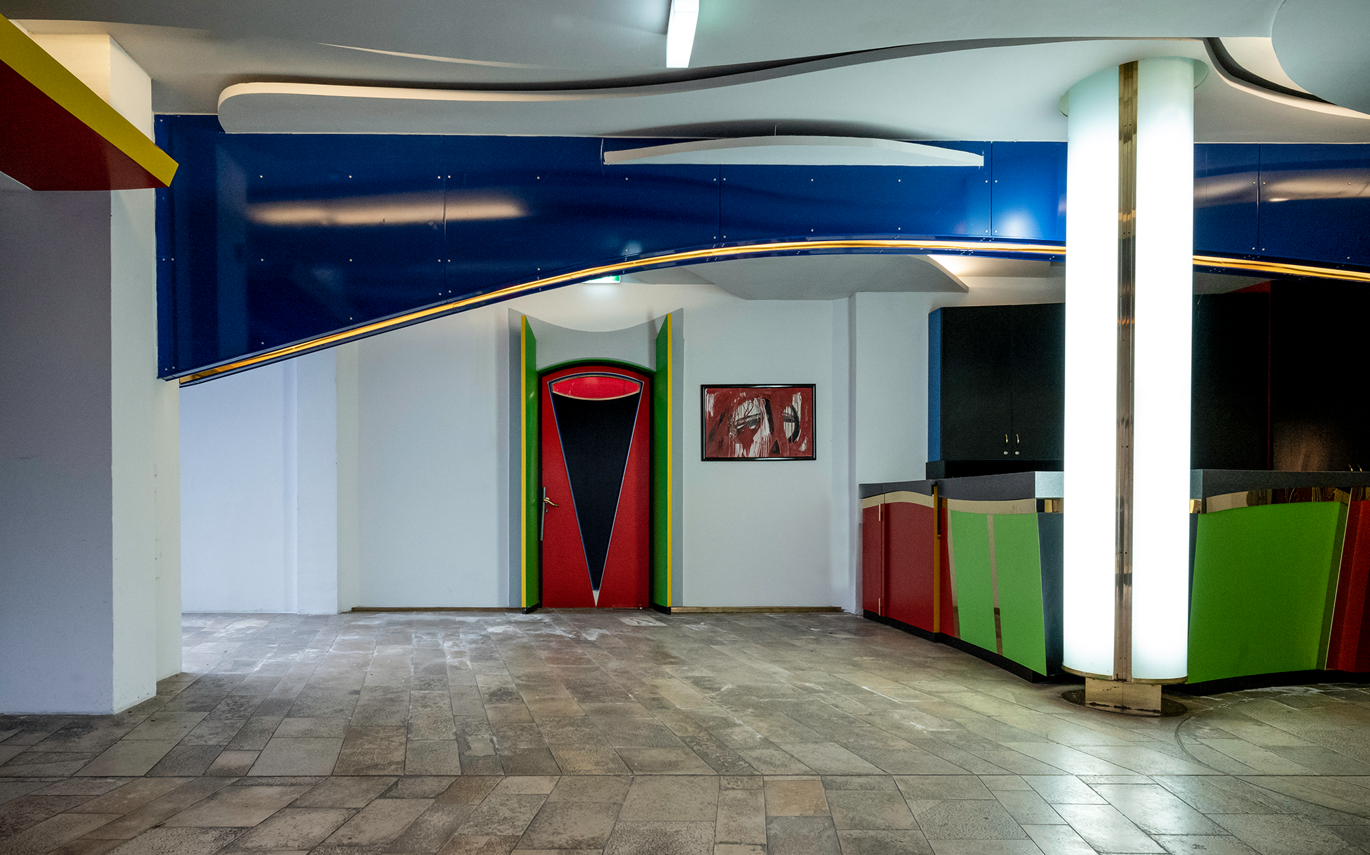 The large sculpture "The Sleeping Man" on the right bank of the Danube houses a patented hotel. Architecturally, the Rotel Inn reflects the themes of overnight stays and water. The individual parts of the 85-meter-long building form a reclining, sleeping person. Slopes and forms are modelled after a ship's bow and waves. The interior is dominated by water lines on the ceilings and decorative elements in primary colours. The entrance area consists of two 15-meter-high head-shaped walls.
