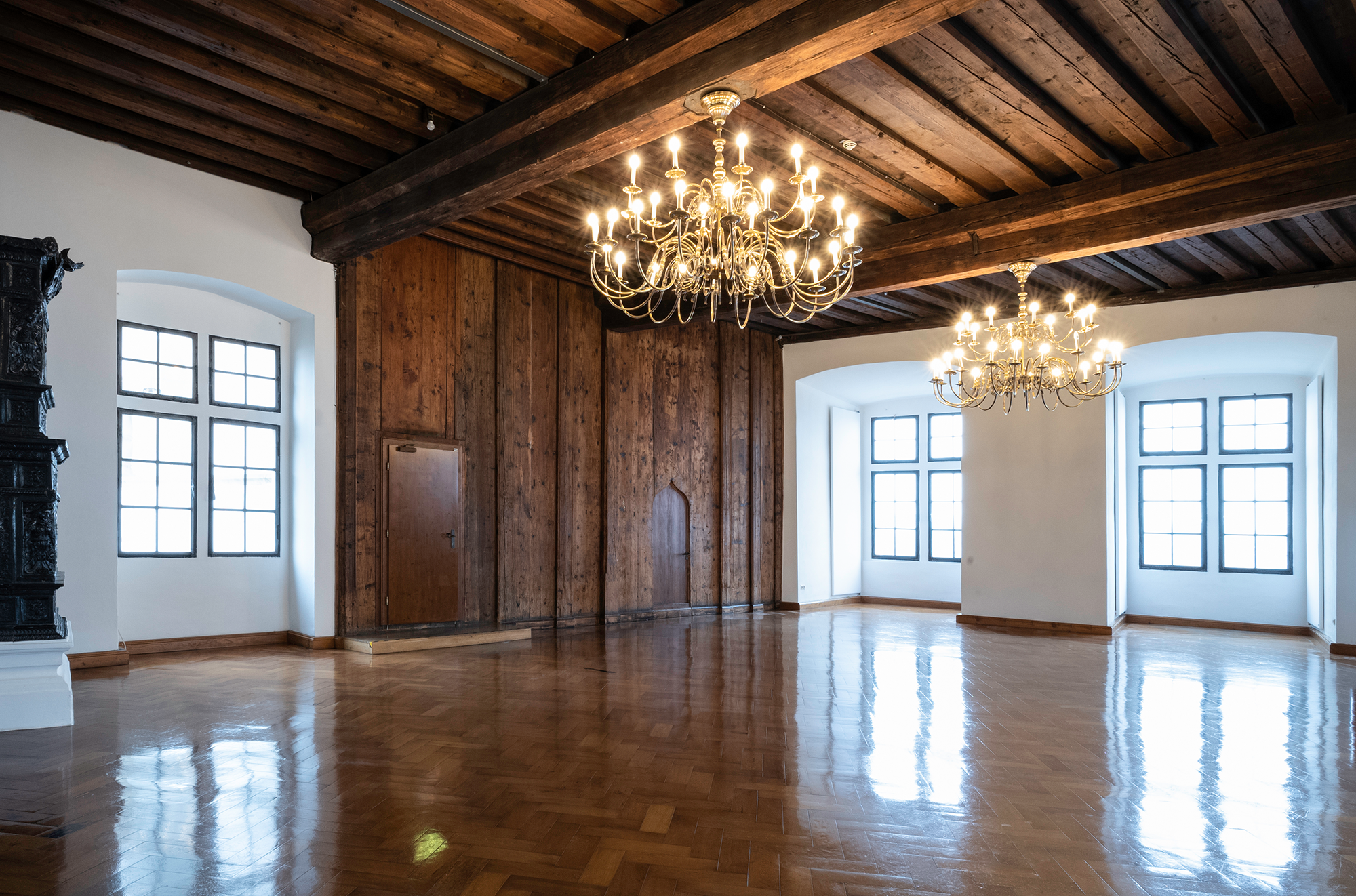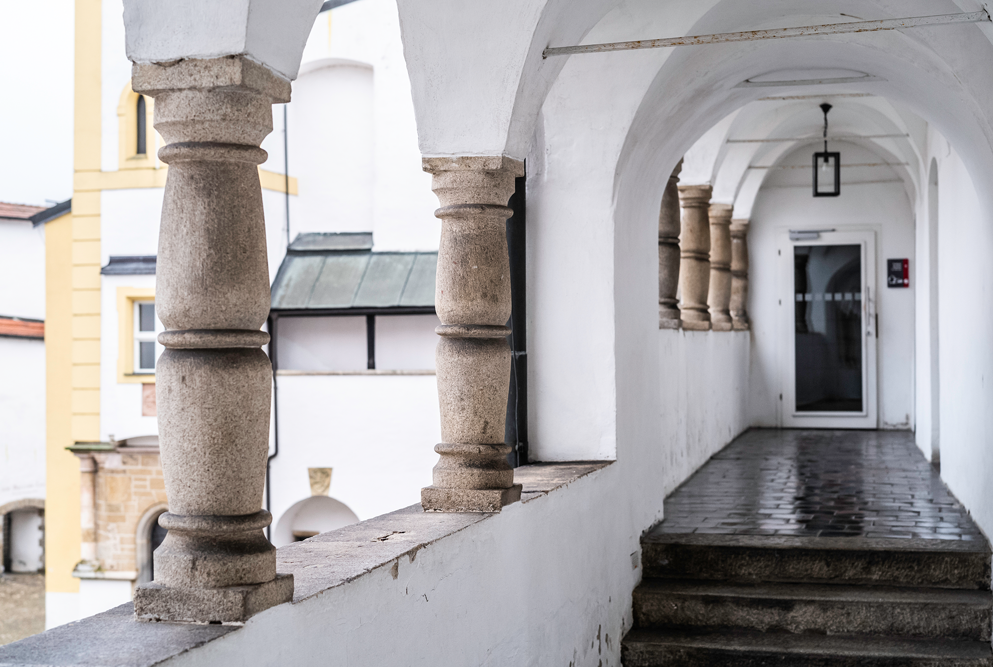 The inner castle courtyard: The Gothic frescoes on the low cross vault of St. George's Chapel are striking here. An open arcade (Renaissance) connects the Fürstenbau with the Schachnerbau. This magnificent hall building (1499) houses the partly wood-panelled Knights' Hall.