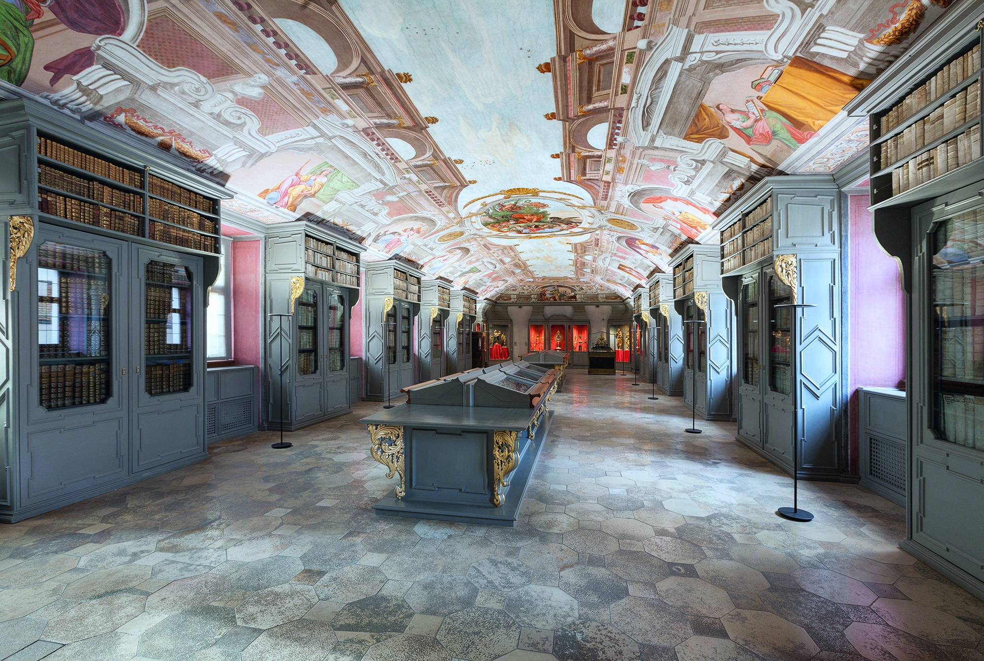 In 1694 Johann Carlone created frescoes for the former Prince-Bishop’s library. After extensive restauration between 1984 and 1986, they can now be seen in their original splendor. They show an illusionist architecture with personifications of various arts and sciences. The spacious room combines its historical furnishings with the Baroque collection of books, and valuable objects from the Cathedral treasury. The overall effect provides visitors with a rich experience.