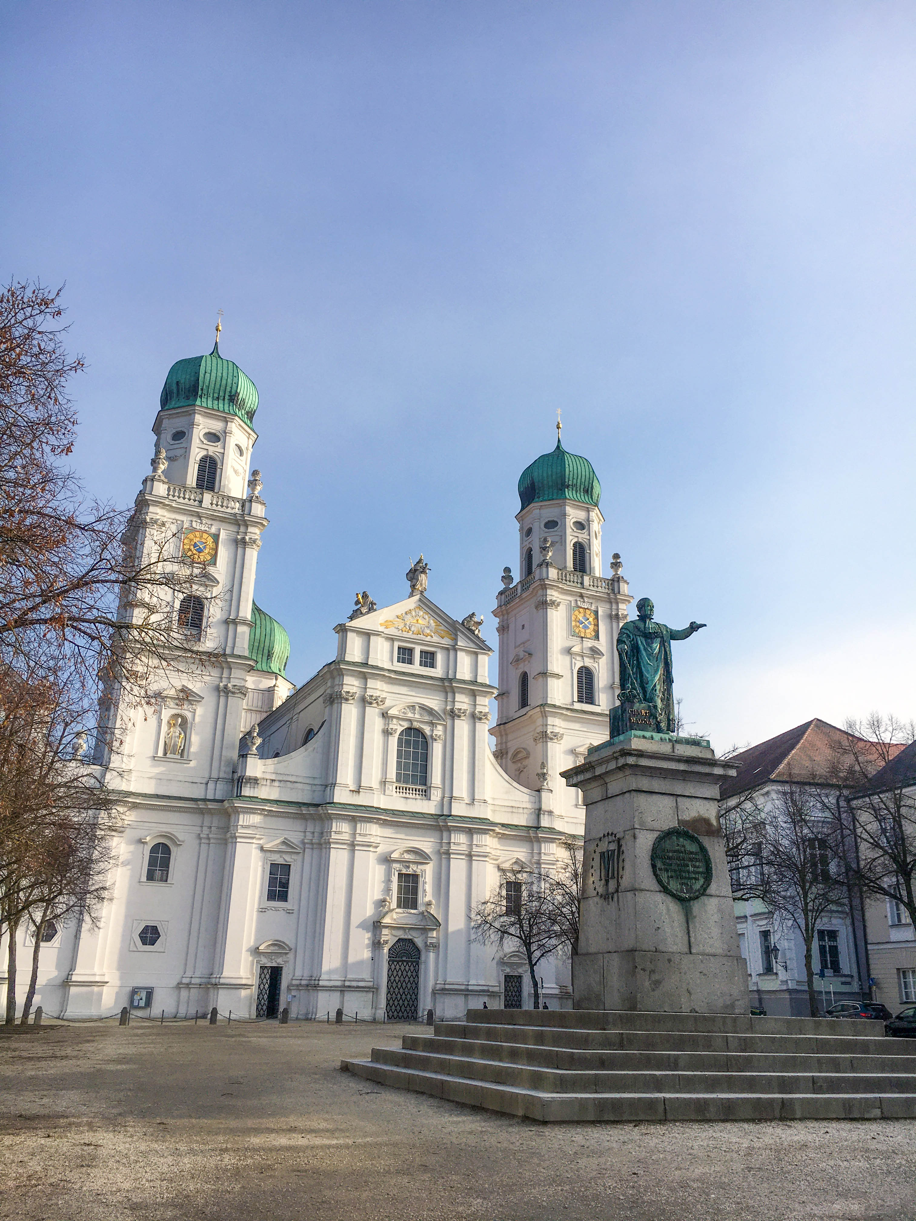 You can see the Cathedral’s “guardian” on many of those shared pictures: the statue of the first Bavarian King Maximilian Joseph I., in short: the “Max Monument”.  This monument standing in the Cathedral’s forecourt with several steps leading up to its base is the perfect foreground for photos with perspective. The citizens of Passau named this bronze statue “The Rain Checker”: His stretched out left arm looks like he is trying to feel the first raindrops.
